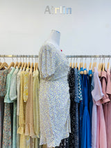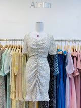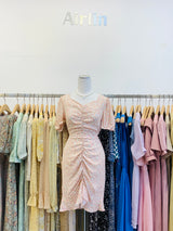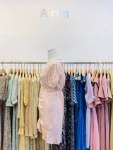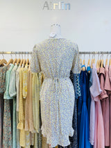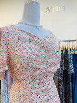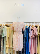 The dress features a delicate floral pattern spread across a soft, pink fabric.