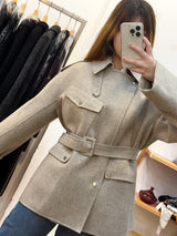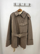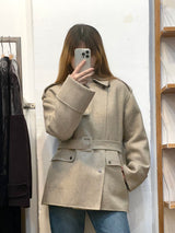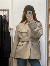 This oversize gray short coat is crafted from 100% wool, blending style and comfort seamlessly. Its elegant design embodies modern urban fashion while ensuring a luxurious wearing experience. The wool material provides exceptional warmth, ideal for colder seasons. The oversize cut not only enhances style but also offers ample room for comfortable movement, even when layered. The versatile gray shade is both classic and easy to pair with any outfit, making it suitable for both formal occasions and casual wear, showcasing your elegance and taste effortlessly.
