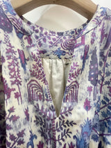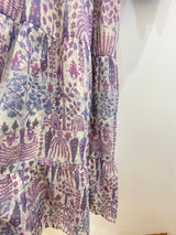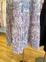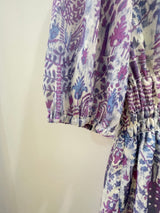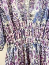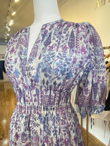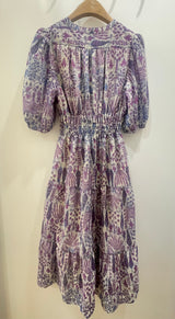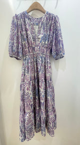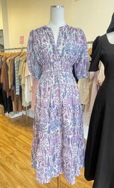 A vibrant midi dress featuring an intricate all-over purple and blue botanical print. This feminine piece is designed with a flattering V-neckline, a comfortable smocked elastic waist, and a tiered flowy skirt for an effortless bohemian look.