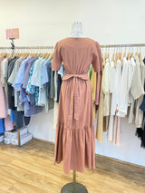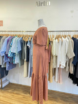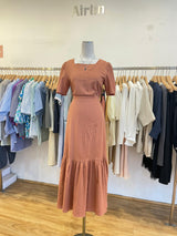 This elegant dress, showcased in a sophisticated shade of burnt orange, is the epitome of grace and style.