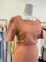 The ribbed texture adds a touch of uniqueness while the short sleeves and modest neckline make it versatile for various occasions.