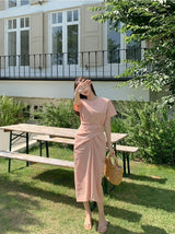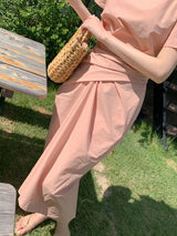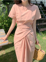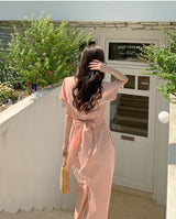 This elegant pink maxi dress features a flowing silhouette for a graceful look. The waist tie detail accentuates the figure, while delicate draping adds depth and texture. Made from lightweight fabric, it offers both comfort and style for various occasions.