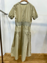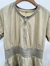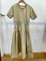 A modern olive-khaki midi dress featuring a sporty zip-front neckline and a flattering wide-cinched waistband. Its lightweight, structured fabric and tiered skirt provide a contemporary, feminine silhouette suitable for versatile daily wear.