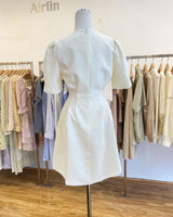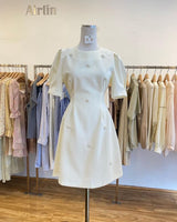This dress features a pristine white color that exudes purity and grace, while delicate pearl embellishments adorn the upper portion, adding a touch of elegance and refinement. The short length of the dress showcases your legs with a playful and flirty allure.