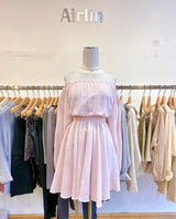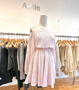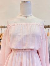 Indulge in the romantic allure of our pink off-shoulder dress.