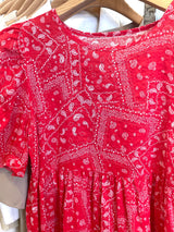 Make a bold statement with this eye-catching red puff sleeve dress, featuring a vibrant red base and intricate white ethnic-inspired patterns. The classic round neckline and soft puff sleeves bring a touch of vintage charm, while the flowing silhouette keeps you comfortable and stylish all day long.