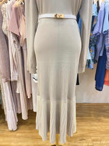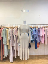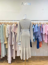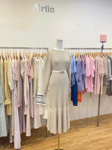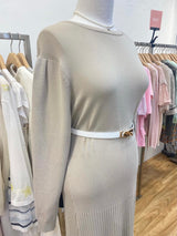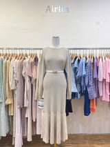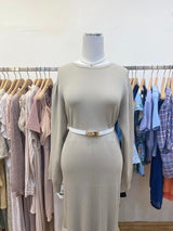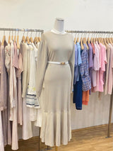 This beige dress features a sleek, fitted silhouette that hugs your body, offering a simple yet elegant look. Its minimalistic design and neutral color make it a versatile wardrobe staple, perfect for a variety of occasions while ensuring a refined and polished appearance.