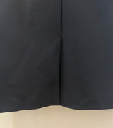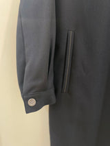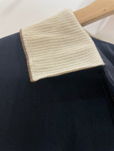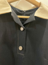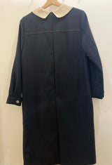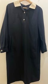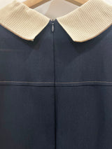 A sophisticated navy midi dress featuring a contrasting cream-colored collar for a polished, vintage-inspired look. This long-sleeve piece is designed with a button-down partial placket, functional side pockets, and silver-toned button accents on the cuffs.