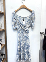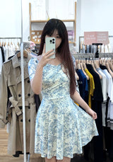 This charming short dress features a delightful blue floral print on a crisp white background. With a flattering above-the-knee length and short sleeves, it’s perfect for warm weather. The cinched waist is enhanced with a stylish tie belt, allowing you to adjust the fit for comfort and style. Ideal for casual outings or summer events, this dress effortlessly combines elegance and ease.