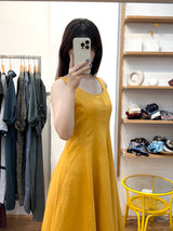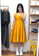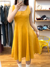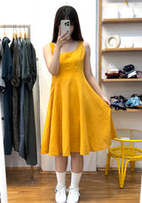 The yellow sleeveless dress features a bright, cheerful hue that instantly draws attention. Its fitted bodice accentuates the waist, while the flowing skirt adds a touch of elegance. The neckline is slightly scooped, offering a flattering silhouette. Perfect for warm weather, the dress can be styled with sandals for a casual look or dressed up with heels and accessories for a special occasion.