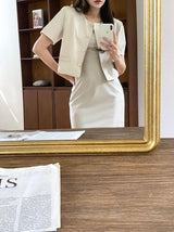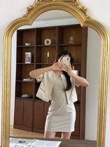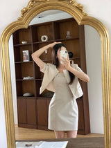 This chic set features a tailored jacket paired with a matching dress, both designed with a minimalist elegance. The understated design makes it versatile for various occasions, offering a timeless look with a modern touch. Crafted from high-quality materials for comfort and a flattering fit.