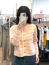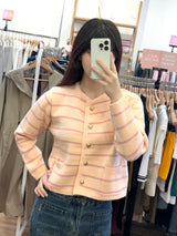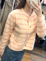 This pink stripe cardigan features a soft, cozy knit that combines pastel and bold pink stripes for a playful yet stylish look. The gold buttons add a touch of elegance, contrasting beautifully with the vibrant hues. With a relaxed fit and ribbed cuffs, it’s perfect for layering over casual outfits or dressing up for a more polished ensemble.