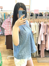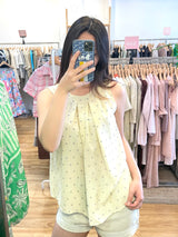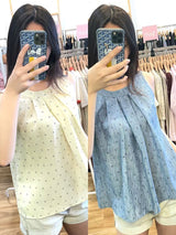 A light waist and airy sleeveless blouse featuring delicate heart-dot prints and soft front pleats for a graceful drape. Designed with a relaxed A-line silhouette, This top offers effortless comfort while maintaining a refined and feminine style. Perfect for warm weather days, it Beautifully with shorts or skirts. Available in butter cream and denim blue for both a sweet and casual look.