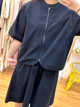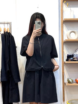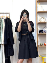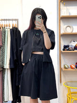 Step into elevated streetwear with this statement-making two-piece set. The oversized black short-sleeve jacket features a relaxed silhouette, dropped shoulders, and a structured collar for a modern edge. Paired with wide-leg short pants that fall just on the knee, this set delivers both comfort and effortless style. Crafted from lightweight, breathable fabric, it’s perfect for layering or wearing solo in warmer weather. Minimalist details and a monochrome palette make it easy to mix and match with your existing wardrobe.