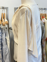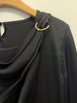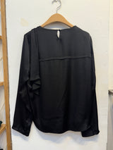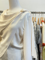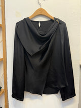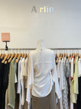 Elegant and effortlessly stylish, this silk-inspired blouse features a smooth, lustrous finish for a refined look. The front showcases asymmetrical pleats for a unique texture, while a flowing ribbon detail at the back adds a touch of elegance. Perfect for both casual and dressy occasions.