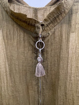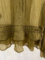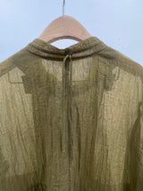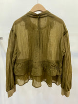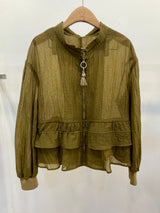 A lightweight olive-green jacket featuring a delicate sheer texture and a unique tassel-detail zipper. Designed with a feminine tiered ruffle hem and a sophisticated stand collar for a breezy, contemporary layer.