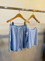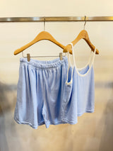 This blue cami and shorts set is made from lightweight, breathable fabric for ultimate comfort and ease. The camisole top features a simple, fresh design that highlights the neckline, while the relaxed-fit shorts create a flattering, casual silhouette. The soft blue hue adds a cool and refreshing touch, perfect for summer days. Ideal for lounging at home, beach vacations, or casual outings—effortless style with a breezy feel.