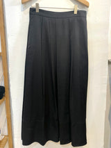 A green silk midi skirt with a smooth, fluid drape and a soft natural sheen—elegant, refined, and effortlessly graceful.