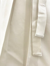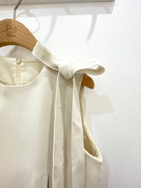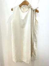 An elegant shift dress featuring a sophisticated round neckline and a statement oversized bow at the shoulder. Designed with a clean, straight silhouette and subtle side-slit detailing, this piece offers a polished and minimalist aesthetic for special occasions.