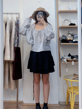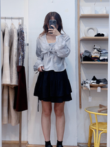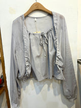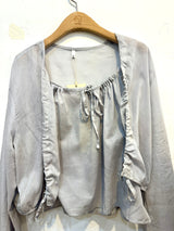 A lightweight, flowy blouse in a soft grey shade. Designed with a gathered neckline and delicate front tie detail, featuring relaxed long sleeves with subtle ruching for an effortlessly feminine look. Perfect for everyday wear or easy styling with skirts and denim.