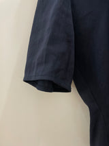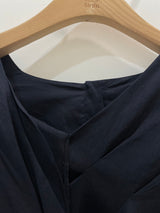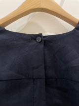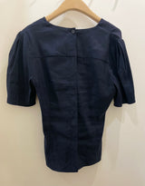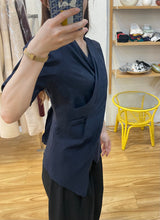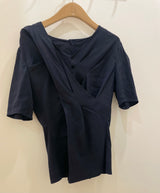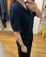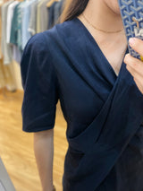 A sophisticated navy-blue top featuring a dramatic surplice wrap-front design that creates a flattering V-neckline. With its structured puff sleeves and asymmetric hem, this piece offers a refined and modern silhouette for professional or evening wear.