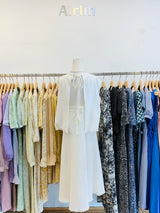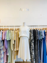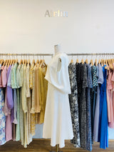 The skirt flows seamlessly, offering a flattering silhouette that speaks to timeless elegance. The pristine white color exudes a sense of purity and sophistication, making it a versatile choice for various occasions.
