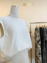 The top piece is sleeveless and has a subtle texture that offers both visual appeal and tactile comfort. It is designed to offer a relaxed fit, ensuring comfort while accentuating the wearer’s grace.