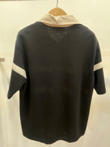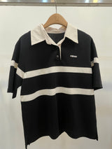 A casual black and white striped polo featuring a relaxed and a contrasting crisp white collar. This comfortable piece includes a classic two-button placket and embroidered chest detail, making it an ideal choice for a sporty yet laid-back everyday style.