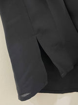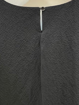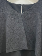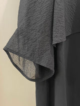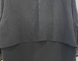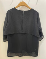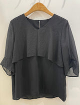 A sophisticated black blouse featuring a unique double-layered design and sheer chiffon sleeves. Crafted with a subtle textured bodice and a relaxed silhouette, elegant look suitable for both office wear and evening outings.