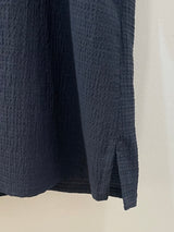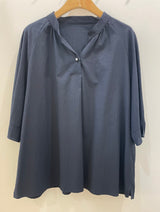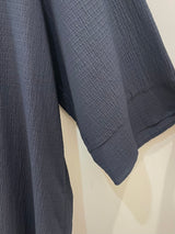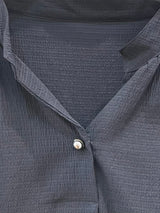 A minimalist dark charcoal blouse featuring a lightweight, crinkled texture and a relaxed, oversized silhouette. Designed with a simple notched neckline and three-quarter sleeves, it provides a breezy and sophisticated look for everyday wear.