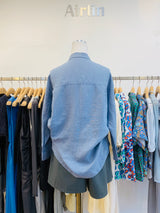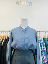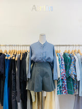 This is a light blue button-down top paired with dark green high-waisted shorts. The top has a relaxed fit and long sleeves, while the shorts are belted at the waist. The outfit is versatile and can be dressed up or down for different occasions. The top is soft and comfortable, making it perfect for casual wear