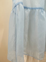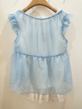A delicate light-blue top featuring a sheer chiffon overlay and feminine flutter sleeves. Designed with a tiered babydoll silhouette and a contrasting white ruffled hem, this breezy piece offers a soft and playful look for warm weather.
