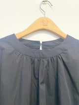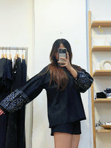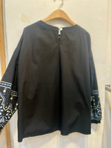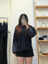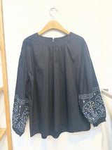 A relaxed-fit black blouse featuring statement balloon sleeves with intricate embroidered detailing. Crafted from lightweight, breathable fabric for all-day comfort. Effortlessly chic and perfect for both casual wear and elevated styling.