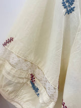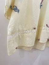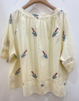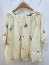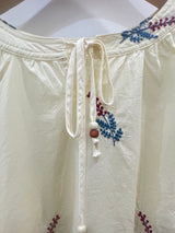 A breezy, cream-colored blouse featuring delicate botanical embroidery and feminine lace-inset detailing. Designed with a relaxed fit, a gathered tie-front neckline, and three-quarter sleeves, this airy piece offers a soft and effortless bohemian look.