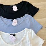 Whether you're pairing it with jeans, skirts, or layering it under jackets or cardigans, this basic t-shirt is incredibly versatile and can be dressed up or down to suit any occasion. The timeless colors - black, white, and blue - offer endless styling possibilities to match your personal style and preferences.