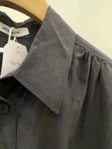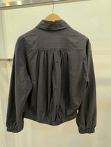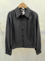 charcoal grey button-down blouse featuring a unique gathered elastic hem and matching cuffs for a soft, blouson silhouette. Detailed with elegant pleating at the shoulders and a classic pointed collar, this piece offers a refined yet comfortable look for any setting.