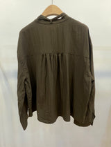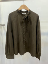 An elegant olive-brown blouse featuring a delicate self-tie bow and a subtle crinkled texture. Designed with a classic button-down front and soft, voluminous sleeves, it provides a sophisticated and airy look for a polished everyday style.