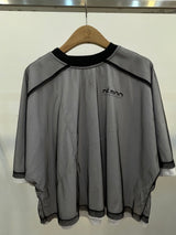 A modern grey mesh top featuring chic graphic and sporty contrast piping. Designed with an oversized silhouette and layered white hem for a cool, contemporary streetwear vibe.