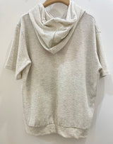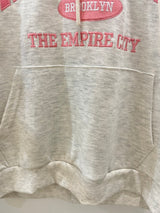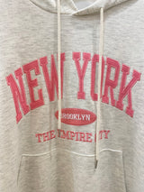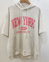 A comfortable, heather-grey hoodie featuring a sporty "NEW YORK" graphic in pink lettering. Designed with a relaxed fit, short sleeves, and a classic kangaroo pocket, this piece is perfect for a casual, athletic-inspired look.