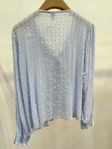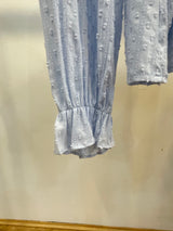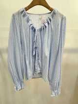 A delicate light blue blouse featuring a charming Swiss dot pattern and a romantic ruffled neckline with adjustable ties. Designed with soft, voluminous sleeves and smocked cuffs, it provides an airy and feminine look for any occasion.