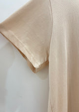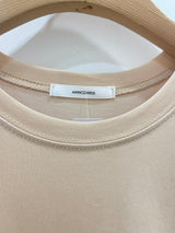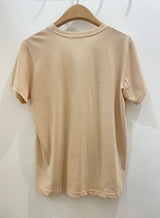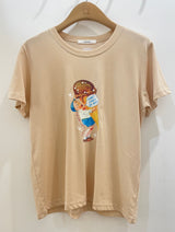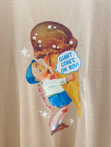 A casual beige t-shirt featuring a nostalgic "Giant Cones" graphic of a boy with a large ice cream scoop. This simple, short-sleeve piece is accented with delicate pearl-like embellishments on the graphic for a unique, playful touch.