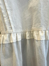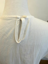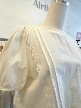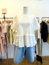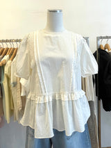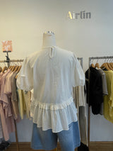 A soft white top featuring puff sleeves and a gently flared peplum hem for a clean, feminine look.