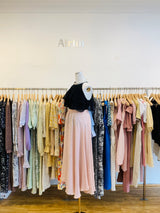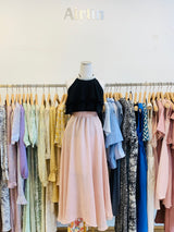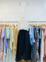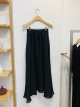 This elegant black midi skirt is a must-have for any fashion-forward wardrobe. Crafted from a soft and flowy fabric, it offers a flattering high-waisted fit and a versatile midi length.