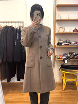 The Soft Alpaca and Wool Coat is where elegance meets ease. Crafted from a premium alpaca wool blend, this longline coat wraps you in feather-light warmth without bulk. Featuring a soft round neckline, oversized patch pockets, and classic button-front closure, it’s designed for effortless layering and timeless everyday wear. The light camel tone brings natural calm and quiet luxury to your wardrobe.
